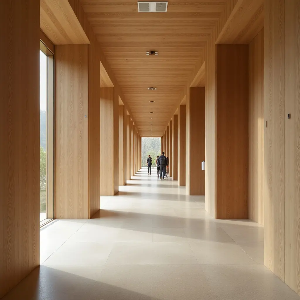 This image showcases a sustainable corridor that beautifully integrates eco-friendly materials and designs. The use of natural wood, recycled elements, and greenery creates a refreshing atmosphere.
