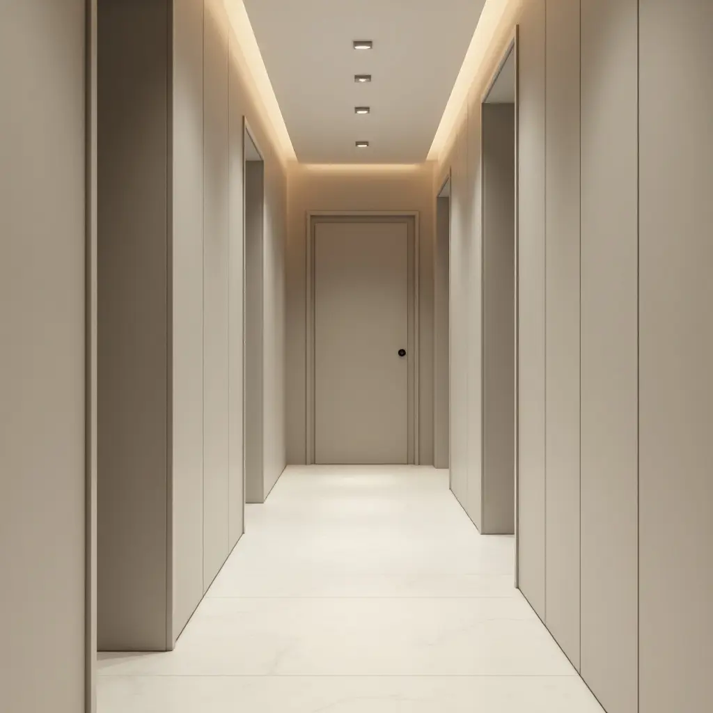 This minimalist corridor showcases sleek lines and a soothing neutral color palette, creating a serene and spacious feel.