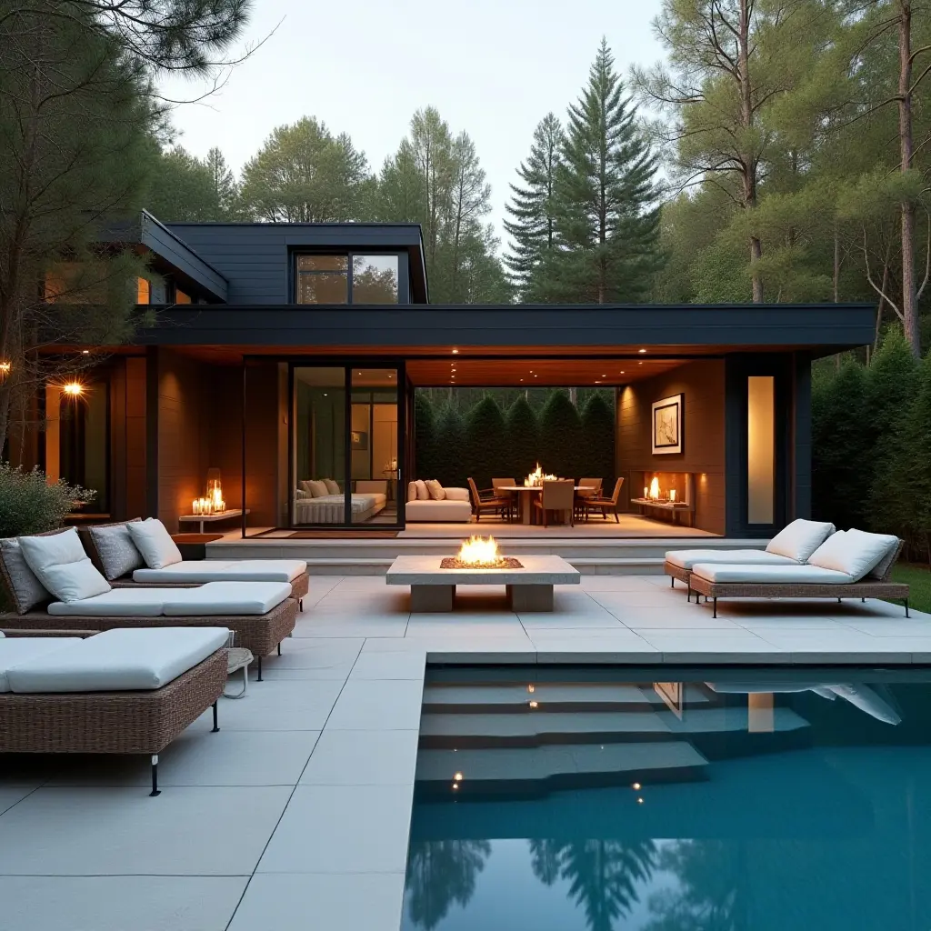This inviting fire pit area by the pool showcases Scandinavian design influences that enhance a clean, minimalist aesthetic. The use of natural materials and neutral tones creates a harmonious space for relaxation.