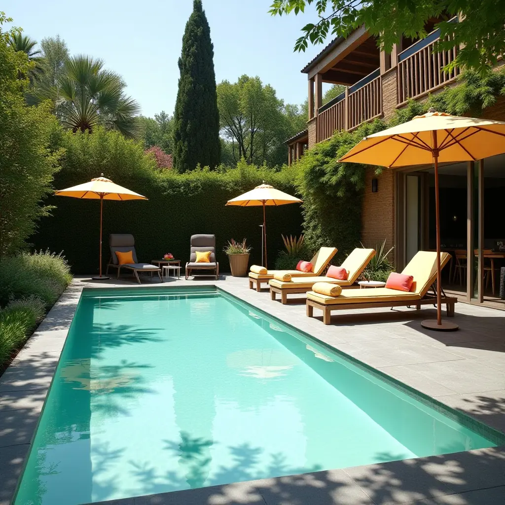 Vibrant Poolside Garden with Scandinavian Decor Elements