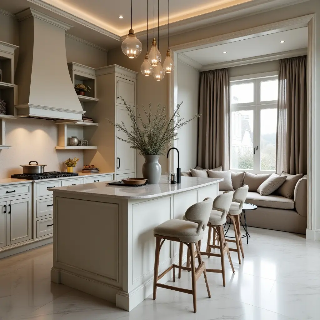Transform your kitchen into a luxurious gathering space with trendy pendant lights and stylish seating. The combination of modern lighting and elegant chairs creates an inviting atmosphere perfect for entertaining.