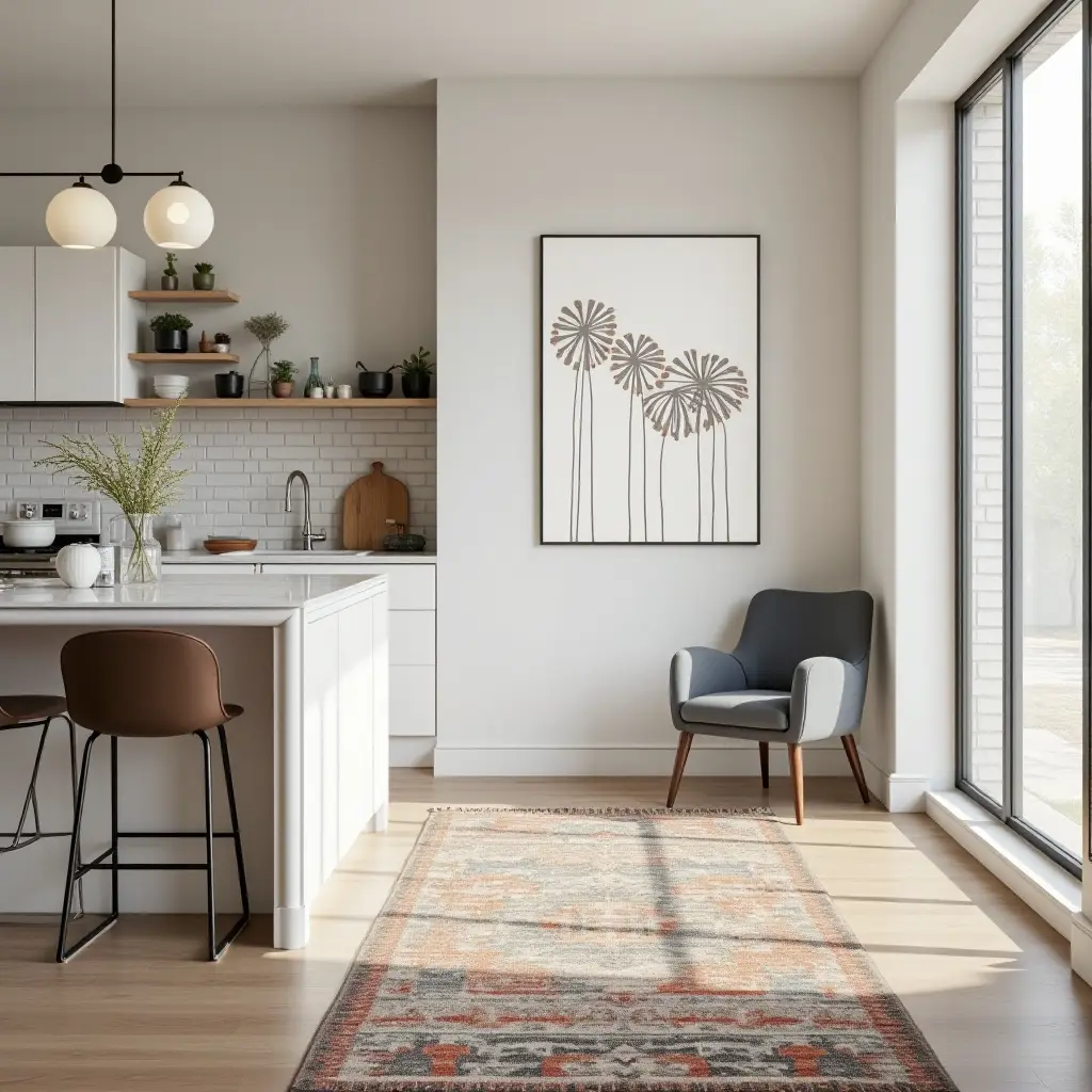 Transform your kitchen into a chic retreat by incorporating stylish rugs and unique wall art. The vibrant rug adds a pop of color and warmth, while the eye-catching wall art serves as a focal point, drawing attention and sparking conversation.