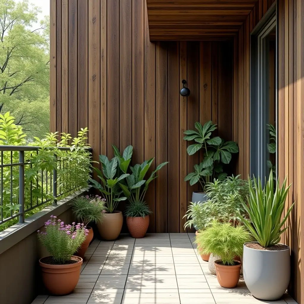 Embrace rustic charm by incorporating a wooden wall adorned with potted plants. This design not only adds warmth to your balcony but also creates a cozy retreat in the midst of urban living.