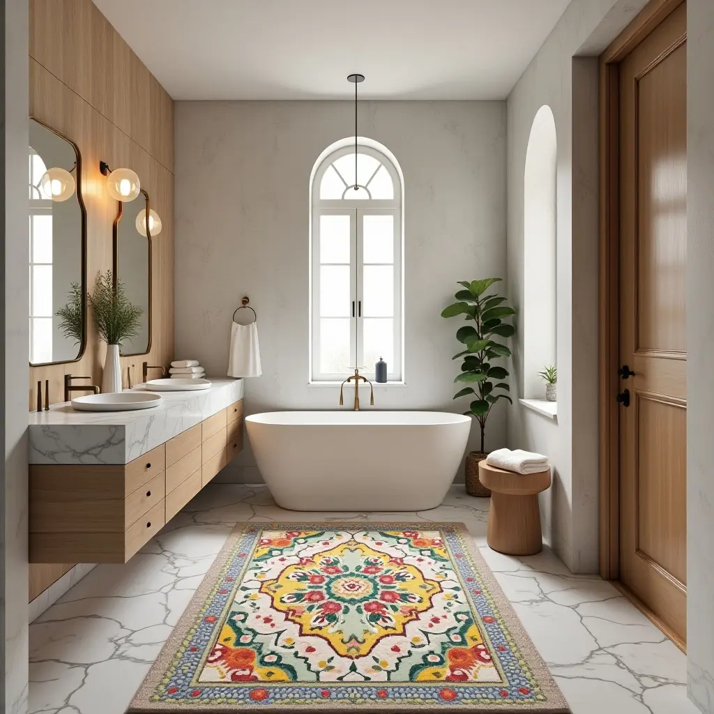 A colorful mosaic rug brings a touch of Mediterranean charm to your bathroom. The intricate patterns and vibrant hues create a lively atmosphere, making the space feel both inviting and stylish.