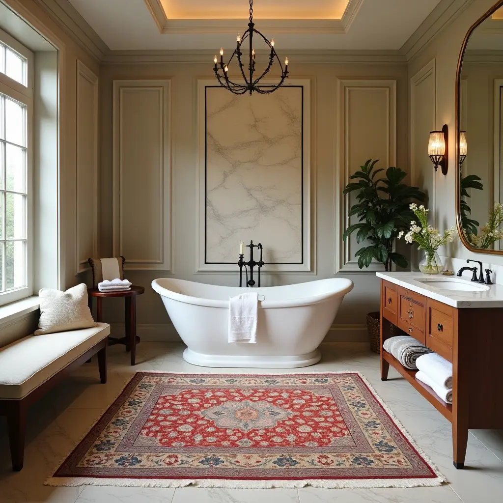 The elegant silk rug introduces a touch of luxurious vintage charm to this classic bathroom. Its rich texture and intricate patterns harmonize beautifully with the vintage fixtures, creating an inviting atmosphere.