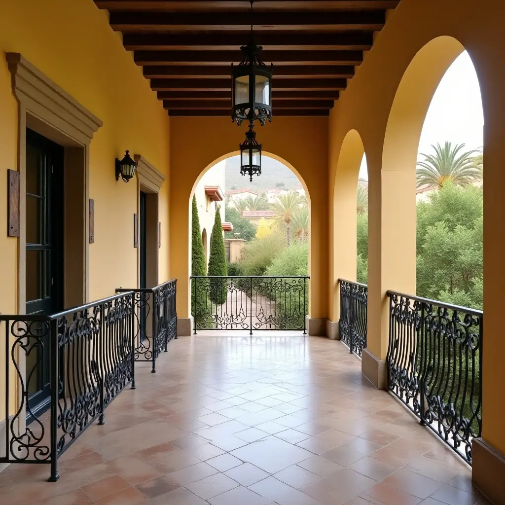 This charming corridor showcases stunning arched doorways and intricate wrought iron details, creating a captivating Mediterranean atmosphere. The elegant curves and decorative elements invite exploration and add character to the space.