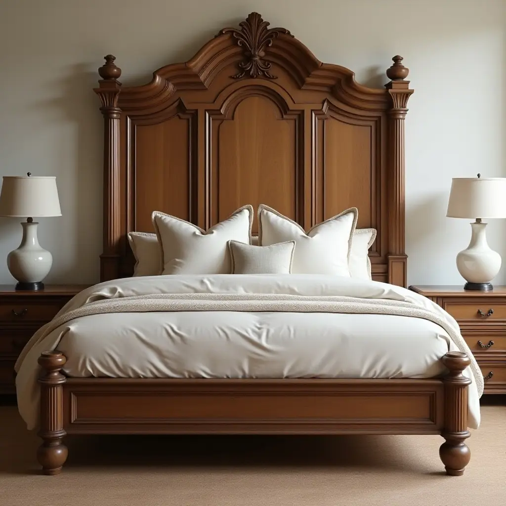 This stunning wooden bed frame showcases intricate carvings that add a touch of elegance to your cottagecore bedroom decor. The soft linens create a cozy atmosphere, inviting relaxation and comfort.