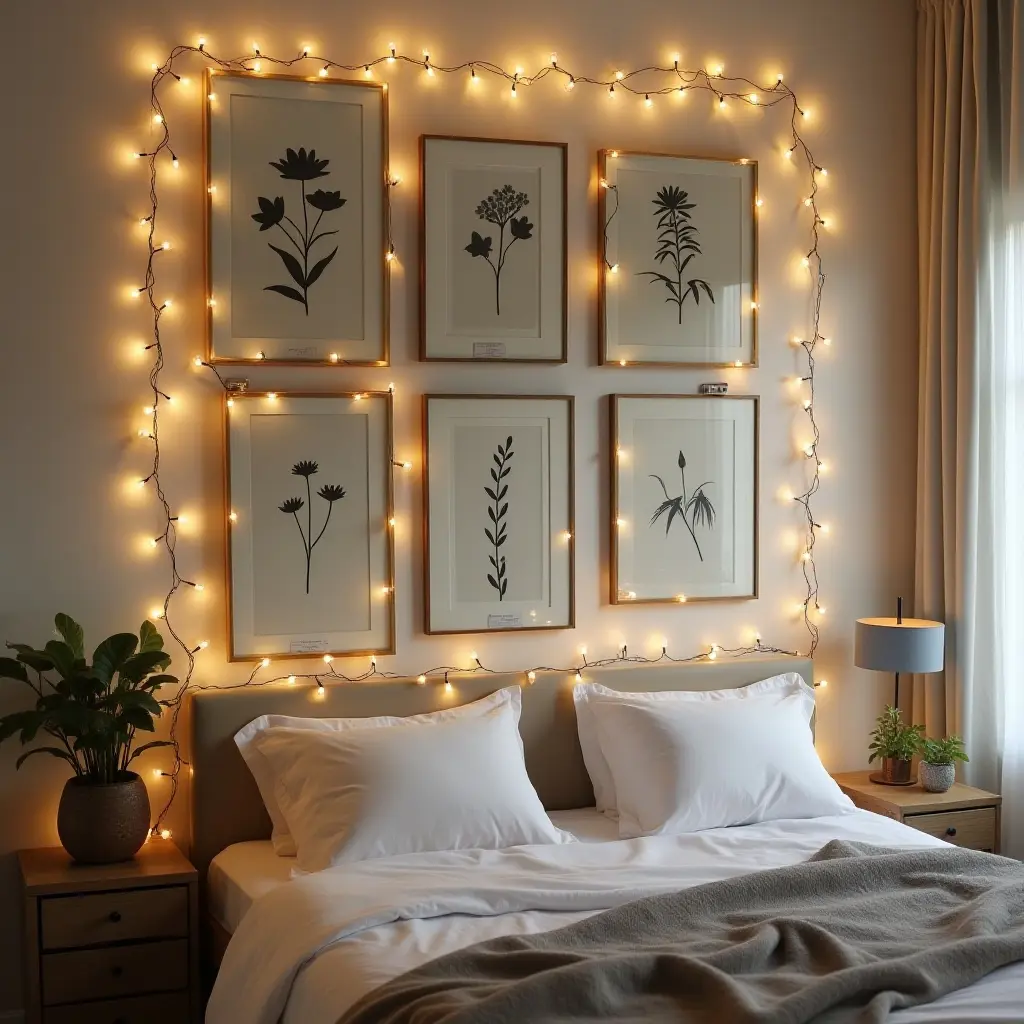Adorning your wall with botanical prints and twinkling fairy lights creates a serene and enchanting atmosphere. The combination of nature-inspired art and soft illumination adds a touch of whimsy to your cozy retreat.