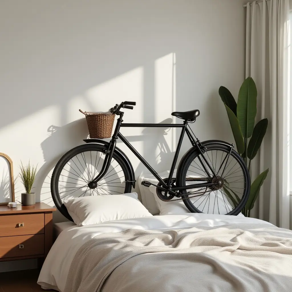 A vintage bicycle used as decor in a bedroom adds a unique touch that embodies the cozy look of cottagecore style. This charming piece serves as both a statement and a functional accent, perfect for displaying flowers or books.