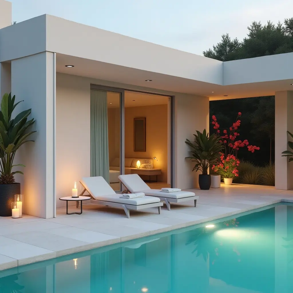 Serene lounge areas by the pool can transform your outdoor space into a peaceful retreat. The soft colors and textures create a calming atmosphere that encourages relaxation and leisure.