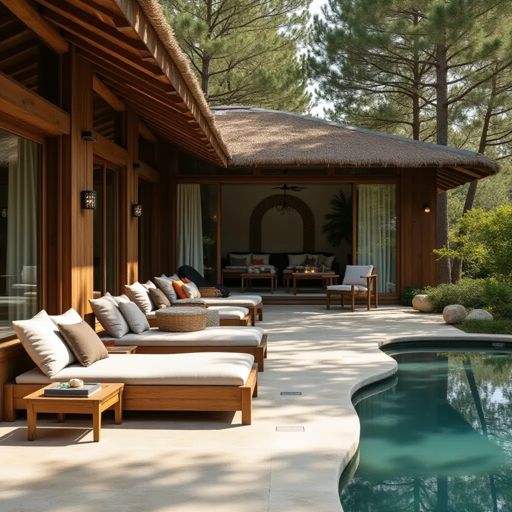 This inviting lounge area features beautifully crafted wooden furniture that enhances the rustic charm of the poolside. The natural materials create a warm and welcoming atmosphere, perfect for relaxation.