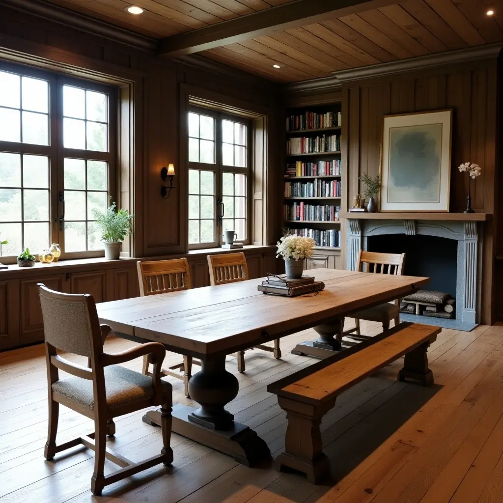 A large farmhouse table serves as the centerpiece of this inviting library, perfect for reading and writing. The rustic wood finish adds warmth and character, making it an ideal spot for a cozy afternoon.