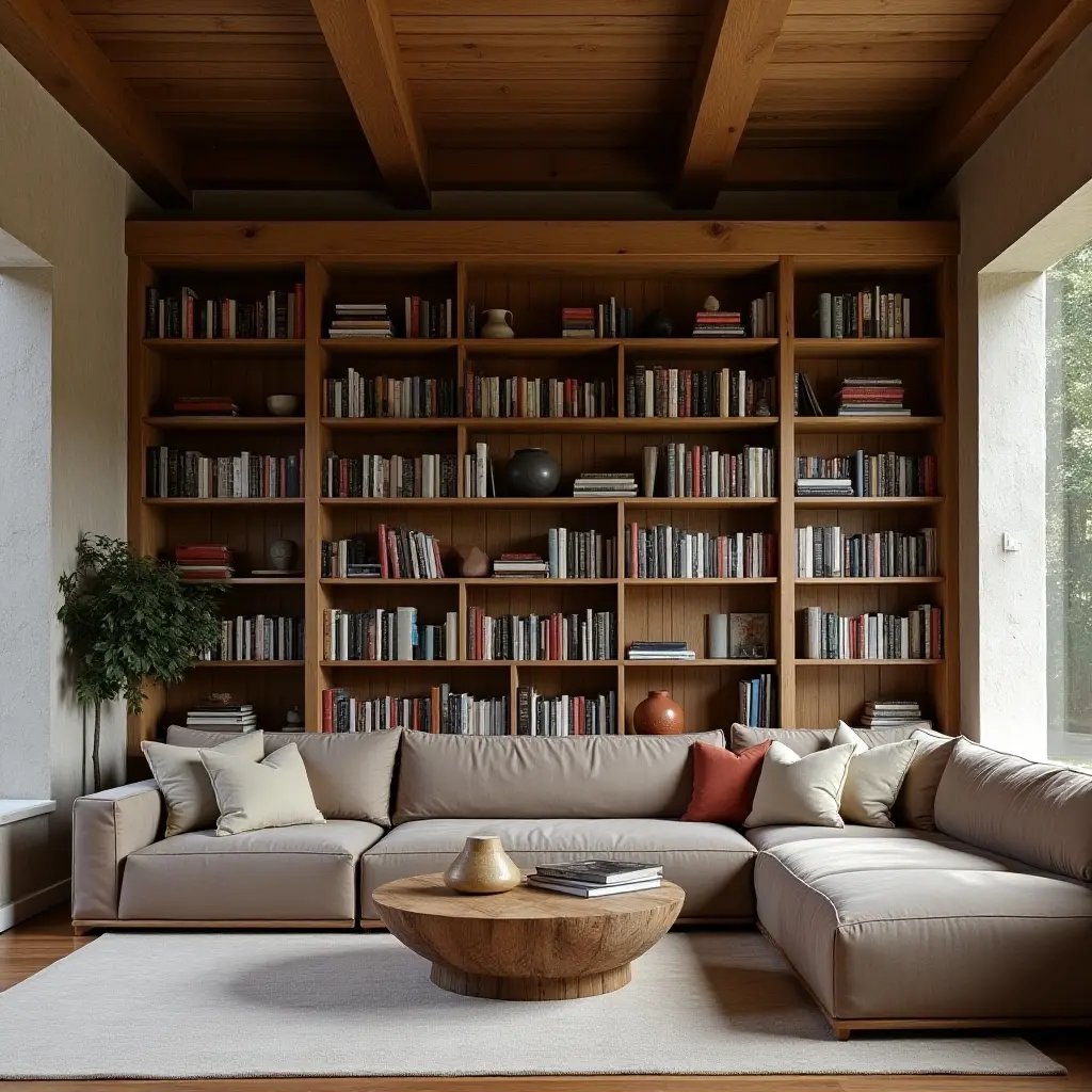 This home library features a stunning large bookshelf made of reclaimed wood, bringing a rustic touch to the space. The natural texture and warmth of the wood create an inviting atmosphere, perfect for showcasing your favorite reads.