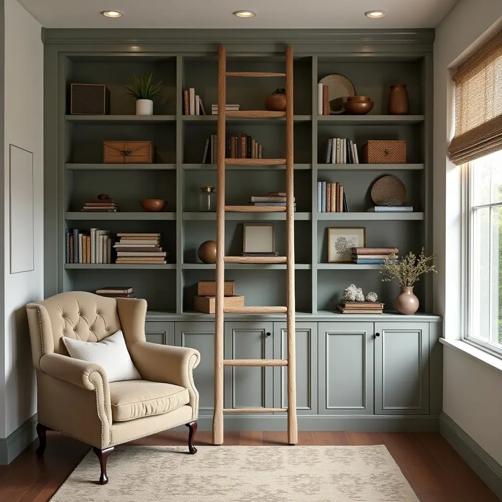 Cozy elements are essential in creating a warm and inviting farmhouse library. The decorative ladder in the image not only serves as a stylish storage solution but also adds vertical interest to the space.