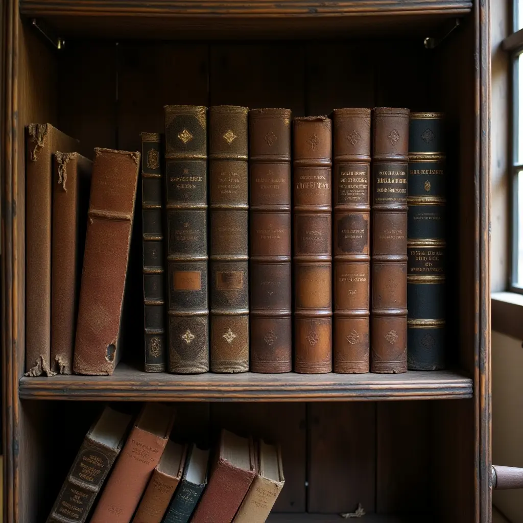A vintage bookshelf filled with classic novels beautifully embodies rustic farmhouse decor. The warm wood tones and well-loved books create an inviting atmosphere perfect for any reading enthusiast.