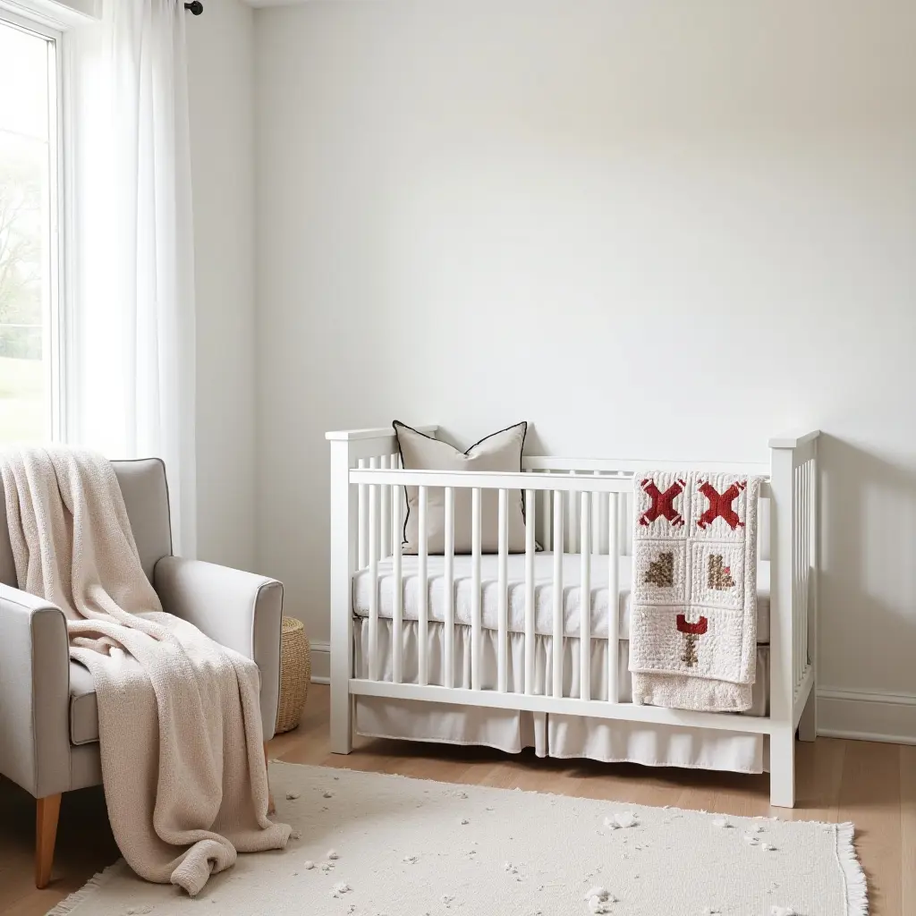 A stylish nursery featuring a cozy farmhouse crib adorned with handmade quilts creates a warm and inviting atmosphere. The rich textures and earthy tones of the quilts complement the rustic charm of the crib, making it a perfect focal point for the room.