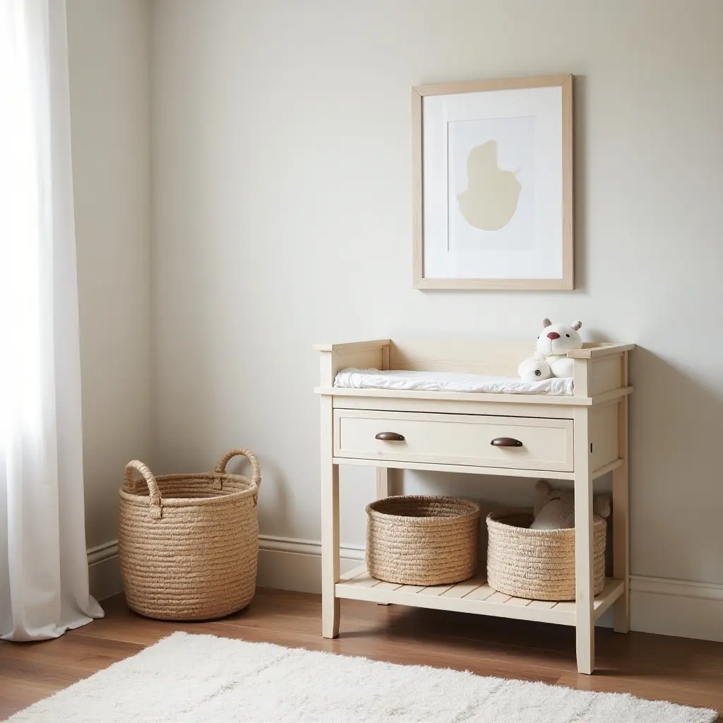 A stylish farmhouse nursery featuring a functional changing table and charming baskets can beautifully blend practicality with rustic aesthetics. The changing table serves as a focal point, while the woven baskets add both storage and texture.