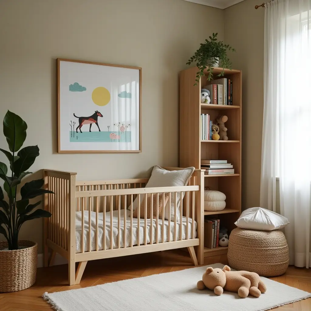 A whimsical mural paired with rustic decor elements creates a charming atmosphere in this nursery. The playful artwork brings a sense of imagination and wonder, making it a perfect backdrop for your baby’s early years.